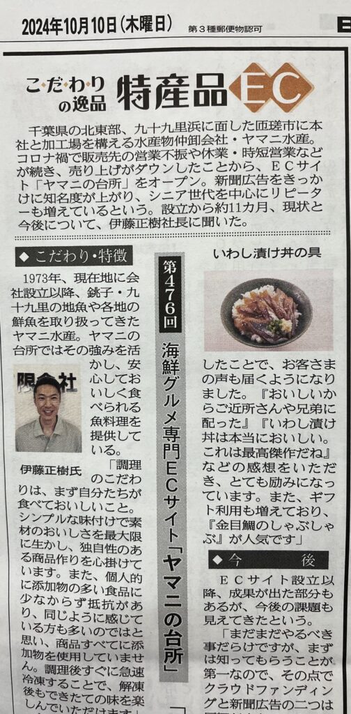 2024年10月10日発行の「日本ネット経済新聞」に、弊社ヤマニ水産が運営する海鮮グルメ専門通販サイト「ヤマニの台所」が掲載されました。