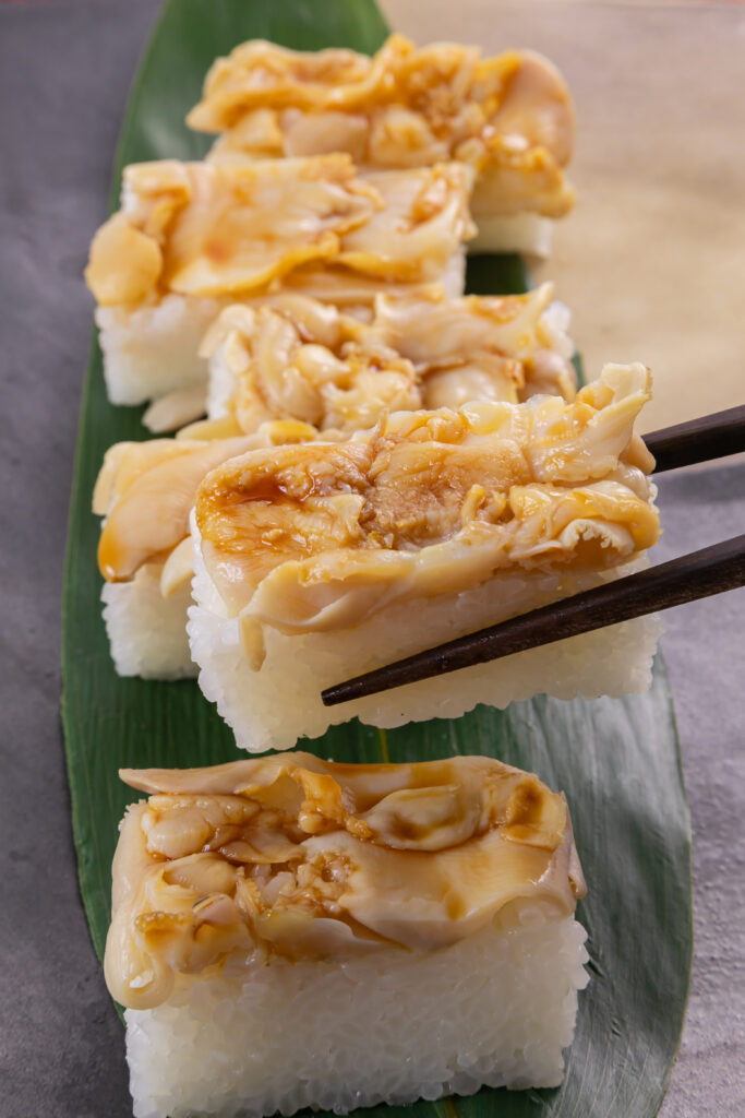 千葉県・九十九里浜で水揚げされた天然の地はまぐりを贅沢に使用し、熟練の寿司職人が一つ一つ丁寧に押し寿司に仕上げました。